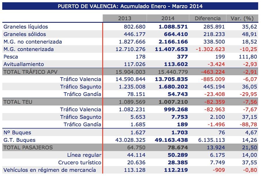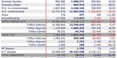 Los puertos de Valencia, Sagunto y Gandía, gestionados por la Autoridad Portuaria de Valencia, han canalizado un total de 15.440.779 tn durante el primer trimestre del año, lo que implica un descenso del 2,91% respecto al mismo periodo del año anterior.
