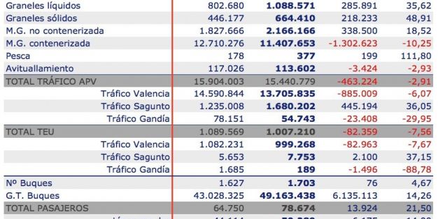 Con respecto al tráfico de vehículos, los puertos de Valencia y Sagunto han manipulado un total de 112.219 unidades, lo que representa un ligero retroceso del 0,80%. Por el contrario, la exportación de automóviles aumenta un 25,61% y la importación avanza un 2,61%. Igualmente, el tráfico ro-ro crece un 24,56% hasta un total de 1.644.331 tn.