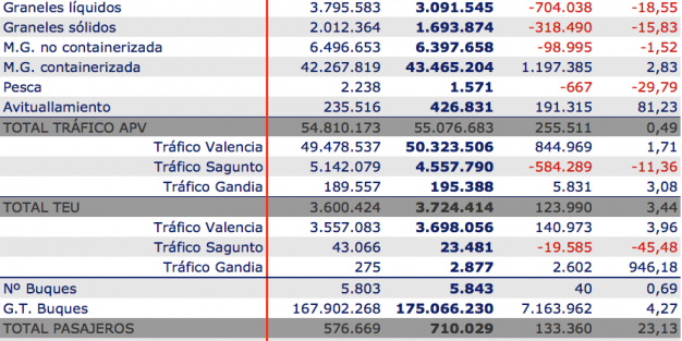 Los puertos de Valencia, Sagunto y Gandia han manipulado 55,08 millones de tn hasta octubre, lo que supone un un incremento del 0,49% respecto al mismo periodo del año anterior. Asimismo, el tráfico de contenedores registra un crecimiento del 3,44% hasta superar los 3,72 millones de TEUs. Estas cifras consolidan a Valenciaport como el primer puerto del Mediterráneo y quinto de Europa tras los recintos de Rotterdam, Hamburgo, Amberes y Bremen.