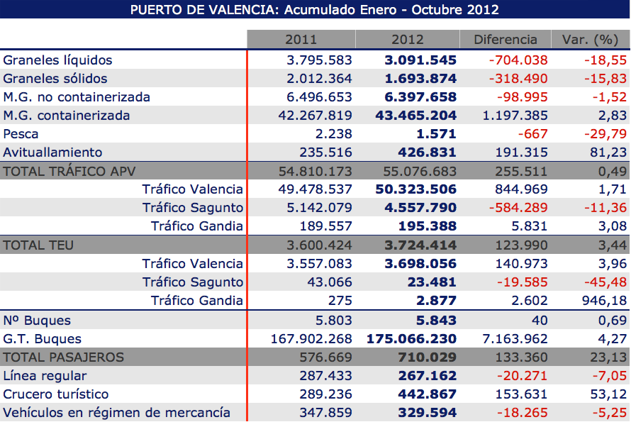 En cuanto al tráfico de cruceros, hasta el mes de octubre se ha registrado un incremento significativo del 53,12%. En este periodo un total de 442.867 pasajeros han recalado en el puerto de Valencia a bordo de un crucero. Por el contrario, el tráfico de línea regular desciende un 7,05% con 267.162 pasajeros. En total, 710.029 personas han utilizado el recinto portuario para sus desplazamientos marítimos, lo que representa un aumento del 23,13% respecto a 2011.