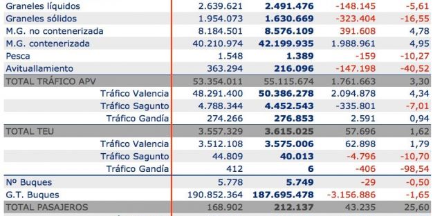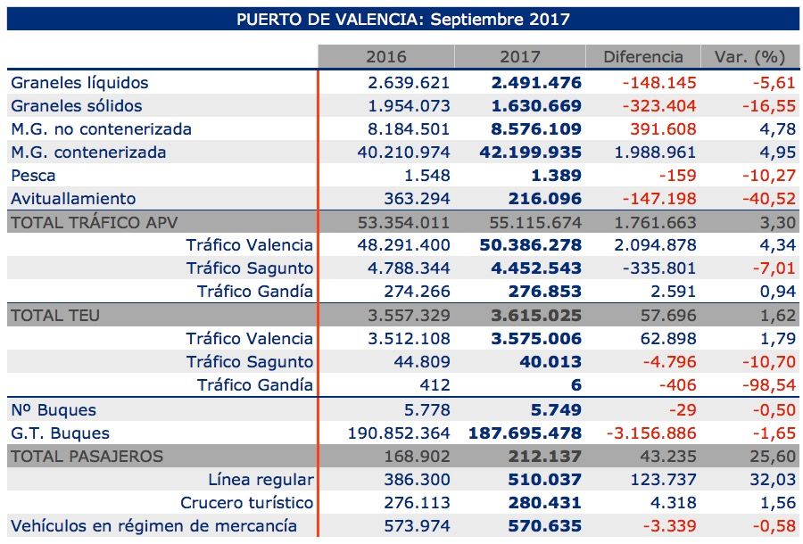 Los puertos gestionados por la Autoridad Portuaria de Valencia han manipulado un total de 55.155.674 toneladas hasta septiembre de 2017, lo que supone un 3,3% más que en el mismo periodo de 2016.