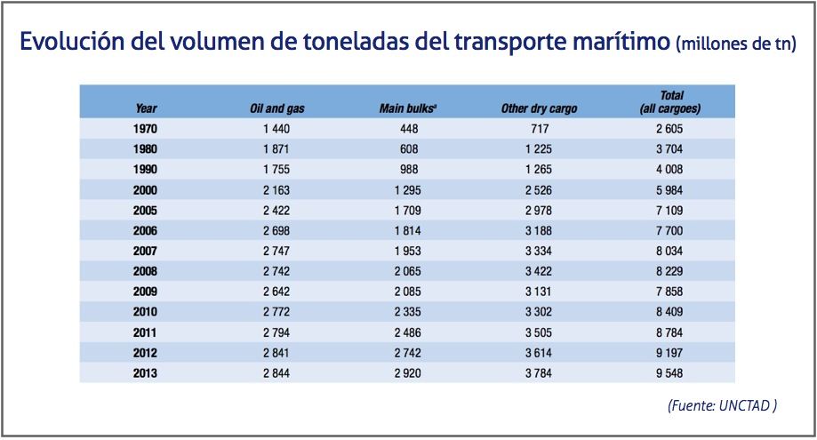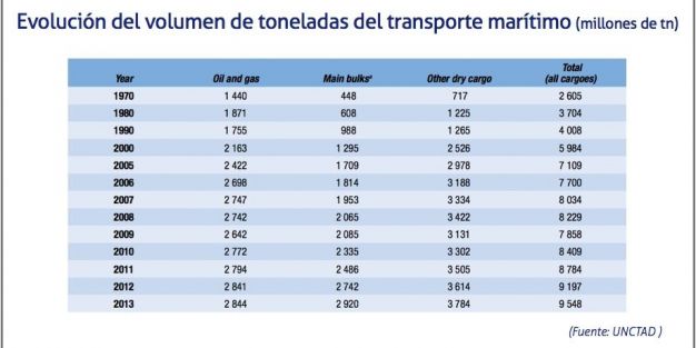 Según el informe anual sobre Comercio Marítimo elaborado por la UNCTAD, el fluctuante desarrollo de la economía mundial hizo que el tráfico marítimo mundial aumentase sólo un 3,8% en 2013, lo que sitúa el volumen total transportado en casi 9.600 millones de toneladas. Gran parte de esa expansión correspondió al transporte de carga seca, en particular mercancías a granel, que según el informe aumentó un 5,6%. Por su parte, el tráfico portuario mundial de contenedores aumentó en un 5,6%, y alcanzó los 651,1 millones de unidades equivalentes de 20 pies (TEU) en 2013.