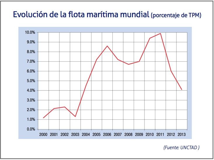 En general, la tasa de crecimiento de la flota mundial fue inferior a la observada en cualquiera de los diez años anteriores, y la tendencia a principios de 2014 apunta a una tasa de crecimiento aún menor para el año en curso. Esta desaceleración evidencia la fase de contracción en que se encuentra el mayor ciclo de construcción naval de la historia, que alcanzó su punto máximo en 2012.