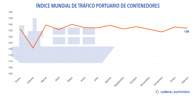 El Índice Mundial de Tráfico Portuario de Contenedores de Drewry ha anotado una caída del 0,7% en febrero, situándose en 137 puntos. Esto supone al mismo tiempo un incremento del 2,8% respecto al dato del mismo mes de 2021.