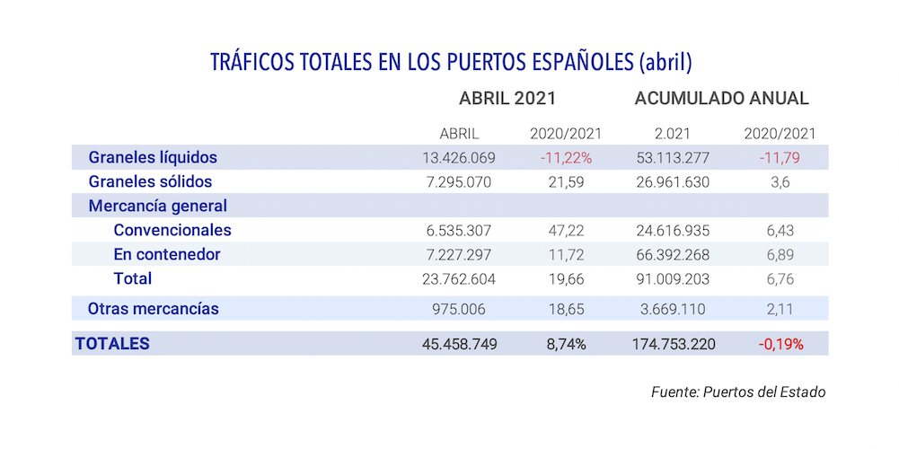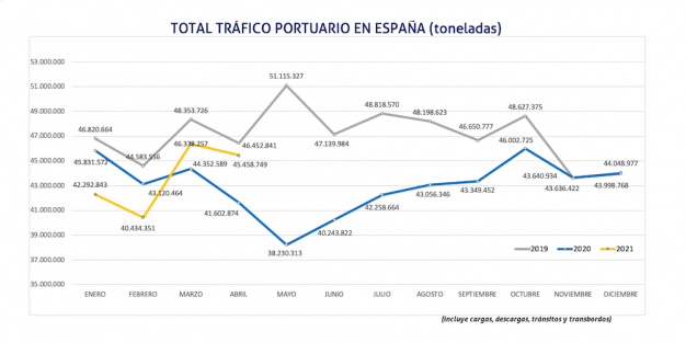En los cuatro primeros meses de 2021, el tráfico portuario total alcanza las 174.753.220 toneladas, un 0,19% menos que entre enero y abril del año pasado.