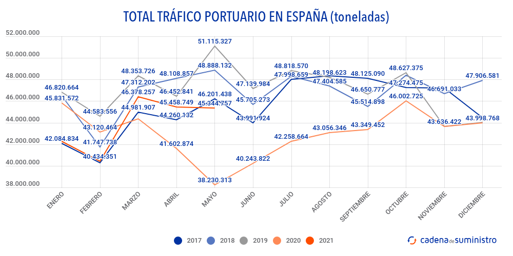 Los puertos españoles han movido en mayo un total de 45.344.757 toneladas, un 18,78% más que en el mismo mes de 2020.