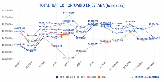 En los cinco primeros meses de 2021, el tráfico portuario total alcanza las 220.037.824 toneladas, un 3,18% más que entre enero y mayo del año pasado.