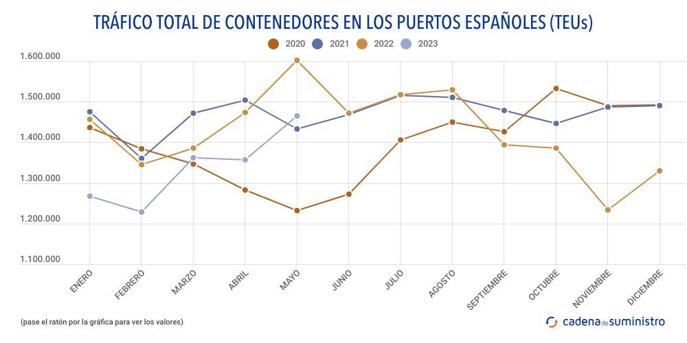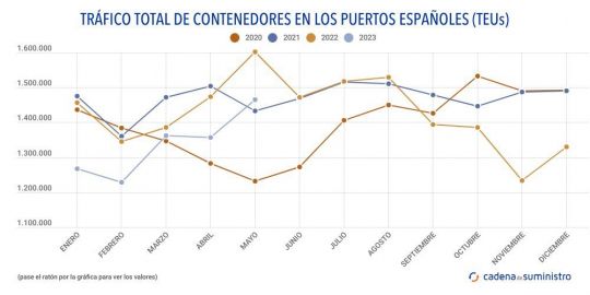 Durante el pasado mes de mayo, el sistema portuario español ha movido 1.464.089 TEUs, un 8,85% menos que en el quinto mes del pasado 2022.