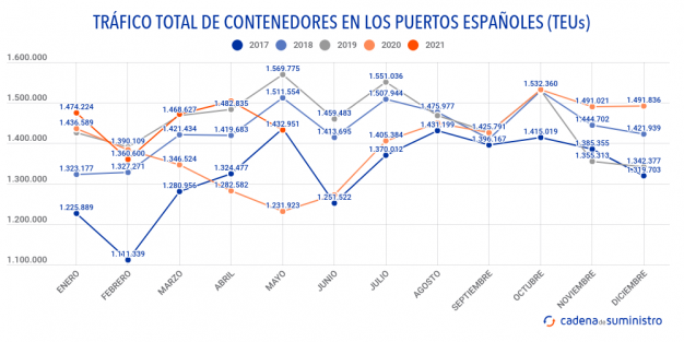 En los primeros cinco meses de 2021, el tráfico total de contenedores del sistema portuario español asciende a 2.533.277 TEUs, un 10,99% más que entre enero y mayo del pasado 2020.