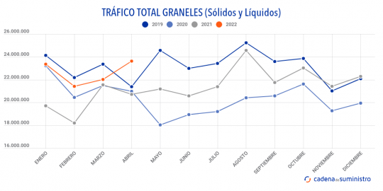 De este modo, en el primer cuatrimestre del ejercicio, el movimiento de graneles líquidos en el sistema portuario suma 6.0047.994 toneladas, con un ascenso anual de un 12,91%, mientras que el de sólidos totaliza 30.293.102, un 12,54% más que en el mismo período del año pasado.