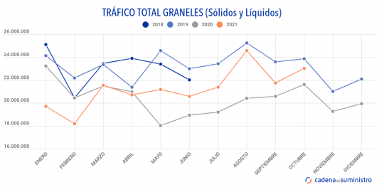 De igual manera, entre enero y octubre, el movimiento de graneles líquidos suma 141.666.487 toneladas, un 0,46% más que hace un año, mientras que el de graneles sólidos crece un 11,11% anual, para sumar 70.874.901 toneladas en el período.