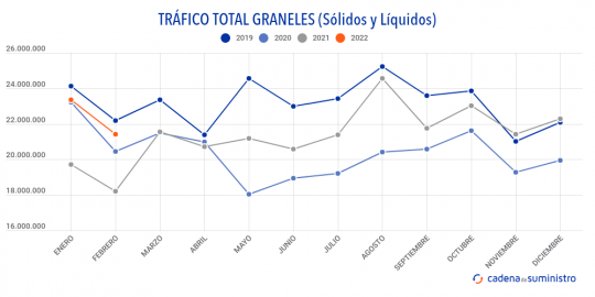 Durante el pasado mes de febrero, los puertos españoles han movido 14.027.536 toneladas de graneles líquidos, un 15,49% más que hace un año, y 7.386.083 toneladas de graneles sólidos, un 21,55% anual más.