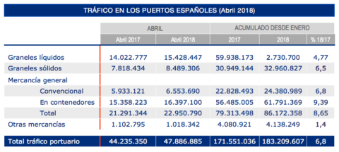 Por puertos, Algeciras sigue al frente del sistema portuario español en el cuarto mes de 2018, con un movimiento total de 9.062.611 toneladas, con un incremento de un 9,46% con respecto a abril de 2017. A continuación, Valencia totaliza 6.597.264 toneladas, un 0,9% anual más, mientras que Barcelona alcanza las 5.350.301 toneladas, un 19,51% más que un año antes.
