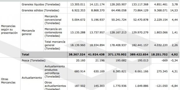En cuanto a la mercancía general, crecen las toneladas totales en un 2,26% hasta octubre, aunque de estos la mercancía en contenedores sólo lo hace en un 1,41%.