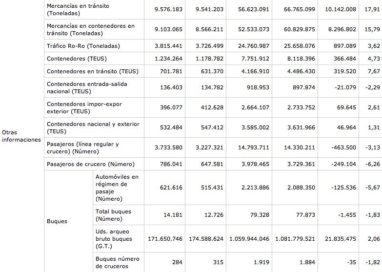 Los contenedores también han mantenido un comportamiento positivo en el acumulado del año, con 8,1 millones de TEUs, han aumentado un 4,73%. El puerto de Valencia mantiene la primera posición en el número de contenedores movidos, con 2,5 millones de TEUs, y registrando un aumento de 1,76%. El puerto de Algeciras se encuentra en segundo lugar con 2,2 millones de tn y un ascenso de 22,32%. El puerto que más ha aumentado es el de Vilagarcía, seguido del de Huelva y el de Motril.