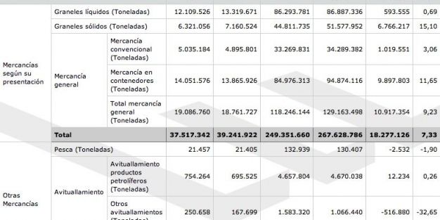 La mercancía recibida en los puertos durante el acumulado hasta julio ha crecido un 7,33%, respecto al mismo periodo del año anterior, con un total de 267 millones de tn frente a las 249 millones de 2011. Por su parte, la mercancía convencional ha aumentado un 3,06%, con un millón de tn más.