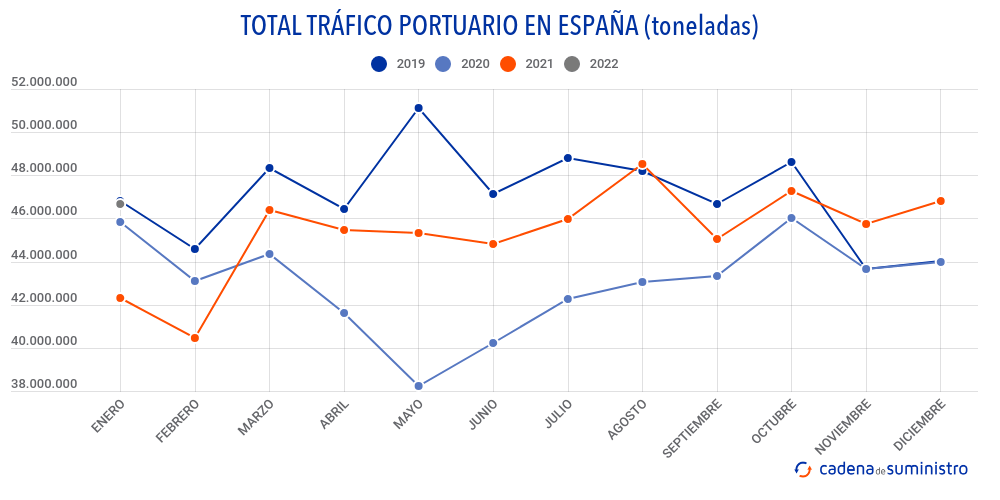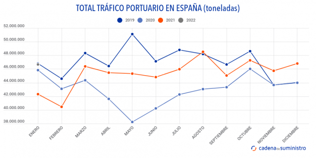 Los puertos españoles han movido el pasado mes de enero un total de 46.678.407 toneladas, un 9,87% más que en el mismo mes de 2021.