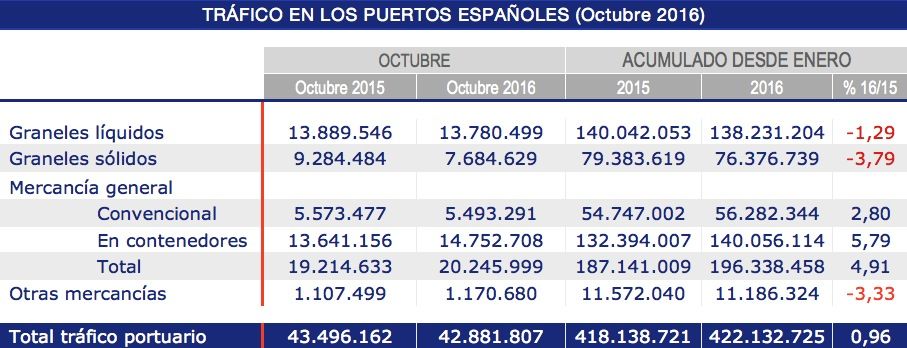 Hasta octubre de 2016, la mercancía general ha aumentado un 4,91% hasta los 196,34 millones de toneladas. Los graneles líquidos, segundo tráfico con más peso tras la mercancía general, han disminuido un 1,29% hasta un total de 138,23 millones de toneladas, mientras que los graneles sólidos se han reducido un 3,79% hasta los 73,37 millones de toneladas.