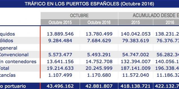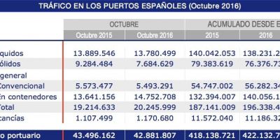 Los puertos españoles han manipulado 422.132.725 tn de mercancía hasta octubre, lo que supone un 0,96% más que las movidas en los diez primeros meses de 2015.