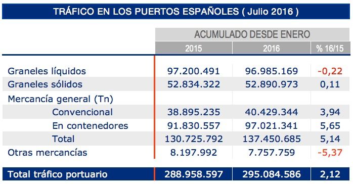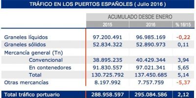 El tráfico de mercancías en los puertos españoles mantiene la tendencia alcista, con un total de 295.084.586 tn manipuladas hasta julio, lo que supone un 2,12% más que las movidas en los siete primeros meses de 2015.