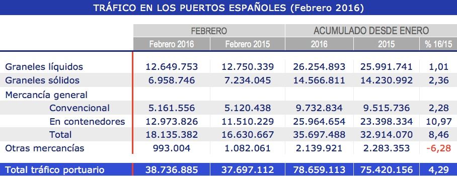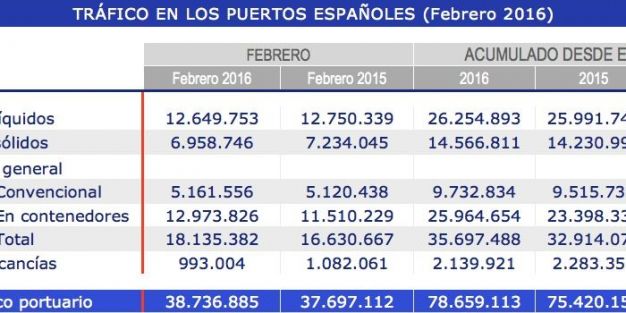 El tráfico de mercancías en los puertos españoles ha iniciado 2016 con la tendencia alcista experimentada en 2015, manipulándose hasta febrero un total de 76.519.192 tn, lo que supone un incremento del 4,62% con respecto a los dos primeros meses 2015.
