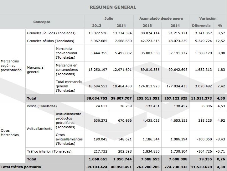Hasta julio, el tráfico portuario español ha crecido por séptimo mes consecutivo y ha alcanzado las 274.730.833 toneladas, con un incremento del 4,3% respecto al mismo periodo de 2013.