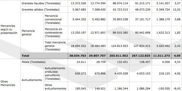 Los graneles sólidos han sido la forma de presentación que más ha aumentado, un 12,5%, superando los 48 millones de toneladas. Los graneles líquidos se han incrementado un 3,5%, elevándose hasta los 91,2 millones de toneladas. La mercancía general, el grupo más numeroso con más de 127 millones de toneladas, ha crecido cerca del 2,4%.