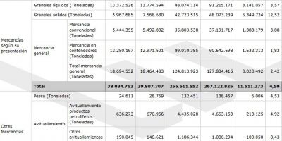 Por Autoridades Portuarias, la Bahía de Algeciras ha superado los 56,7 millones de toneladas de tráfico total, seguida por la de Valencia con 38,8 millones y la de Barcelona con 27,1 millones. En crecimiento porcentual, destacan los experimentados por Pasajes, +26,0%, Almería, +20,7%, Santander, +15,0% y Castellón con +13,4%.