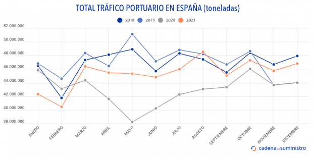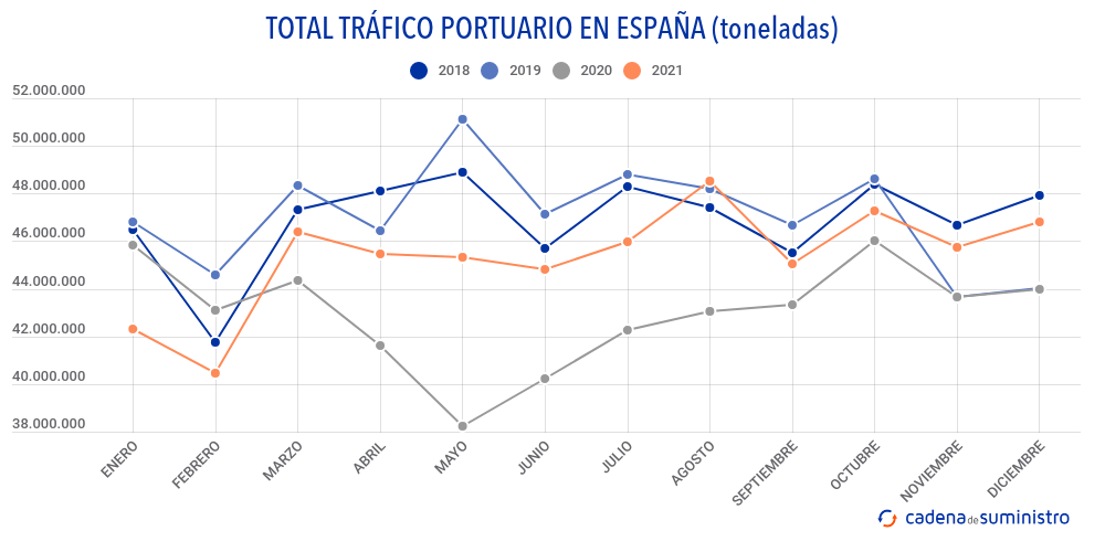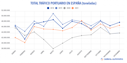 Los puertos españoles han movido en diciembre de 2021 un total de 46.824.939 toneladas, un 46,67% más que en el mismo mes de 2020.