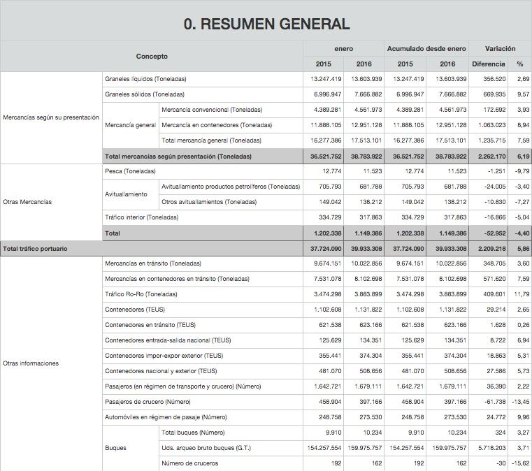 El tráfico de mercancías en los puertos españoles ha iniciado 2016 con la tendencia alcista experimentada en 2015, manipulándose en enero un total de 38.783.922 tn, lo que supone un incremento del 6,19% con respecto a enero de 2015.