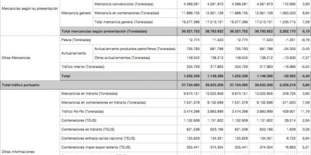 En concreto, la mercancía general ha aumentado un 7,59% hasta los 17,5 millones de toneladas. En este tráfico destacan los puertos de Algeciras con 5,5 millones de toneladas, de Valencia con 4,9 millones de toneladas y de Barcelona con 2,2 millones.