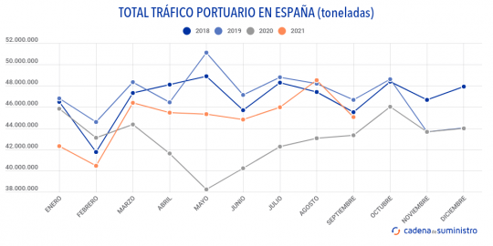 Los puertos españoles han movido en septiembre un total de 45.033.822 toneladas, un 3,87% más que en el mismo mes de 2020.