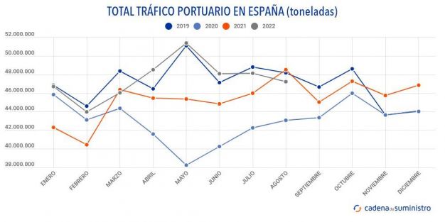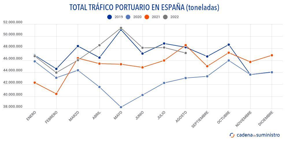 Por detrás, Cartagena suma 2.914.830 toneladas en agosto, con un descenso anual de un 7,14%, Huelva totaliza 2.773.432 toneladas mensuales, un 15,28% menos que hace un año, y Bilbao alcanza las 2.566.428 toneladas, un 7,59% menos que en el mismo mes de 2021.
