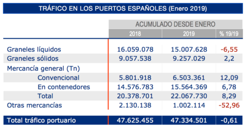 Tras el crecimiento registrado en diciembre de 2018, los tráficos del sistema portuario español han descendido levemente un 0,61% anual en enero, hasta alcanzar un total mensual de 47.334.501 toneladas.