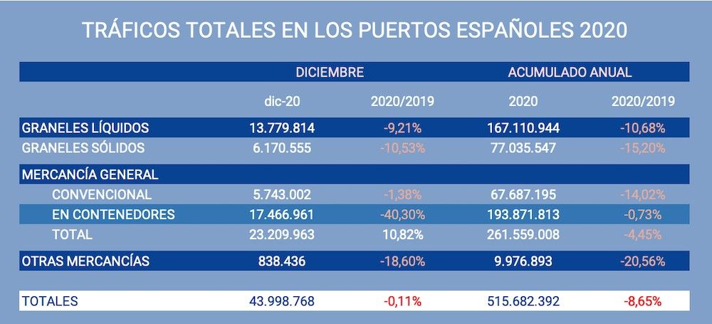 El sistema portuario español cierra 2020 con un tráfico total de mercancías de 515.682.392 toneladas de mercancías movidas, un 8,65% menos que en 2019.