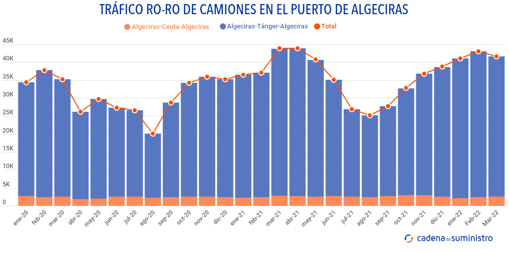 La ruta que conecta Algeciras con Tánger-Med ha movido 38.989 unidades, un 4,70% menos que las 40.912 de marzo del año anterior. Por su parte, en la línea con Ceuta, se ha llegado hasta las 2.556 unidades, que representan una caída del 10,69% en relación a las 2.862 registradas entonces.