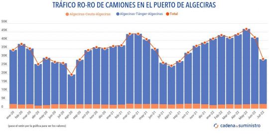 El número de camiones que cruza el Estrecho de Gibraltar en las líneas que conectan el puerto de Algeciras con el norte de África ha llegado a 29.071 en el séptimo mes de 2022, lo que supone un incremento del 7,90% respecto a los 26.943 del mismo periodo de 2021.