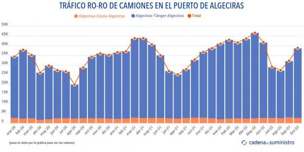 El número de camiones que cruza el Estrecho de Gibraltar en las líneas que conectan el puerto de Algeciras con el norte de África ha llegado a 38.856 en el décimo mes de 2022, lo que supone un incremento del 18,21% respecto a los 32.871 del mismo periodo de 2021.