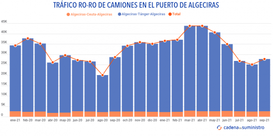 El número de camiones que cruza el Estrecho de Gibraltar en las líneas que conectan el puerto de Algeciras con el norte de África ha llegado a 27.802 en el mes de septiembre, lo que supone una caída del 3,19% respecto a los 28.719 del mismo periodo de 2020.