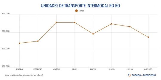De igual modo, en el mes se han registrado un total de 236.334 unidades de transporte intermodal ro-ro, un 1,54% menos que en idéntico período de un año antes.