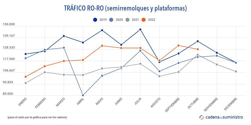 De igual modo, en el mes se han registrado un total de 128.182 remolques, semirremolques y plataformas en régimen ro-ro, un 15,47% más que en idéntico período del año pasado.
