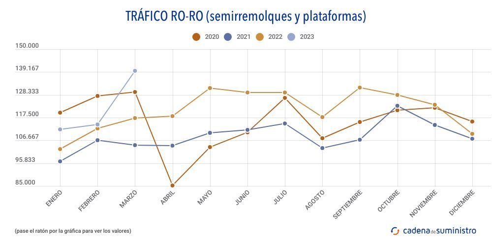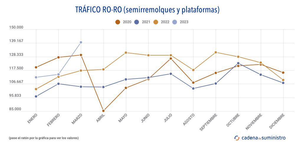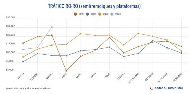 El sistema portuario español ha movido el pasado mes de marzo un total de 6.706.692 toneladas de tráfico ro-ro, un 13,41% más que durante el tercer mes de 2022.