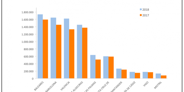 Por puertos, Baleares lidera el tráfico ro-ro del sistema portuario español en febrero, con 891.804 toneladas en el mes, un 1,64% anual más. A continuación, Barcelona acumula 805.833 toneladas, un 18,18% más que hace un año, mientras que Barcelona totaliza 840.720 toneladas, un 6,33% más que febrero de 2017.