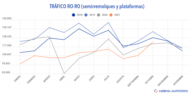 El sistema portuario español ha movido el pasado mes de octubre un total de 5.939.969 toneladas de tráfico ro-ro, un 18,64% más que durante el noveno mes de 2020.
