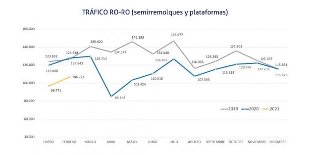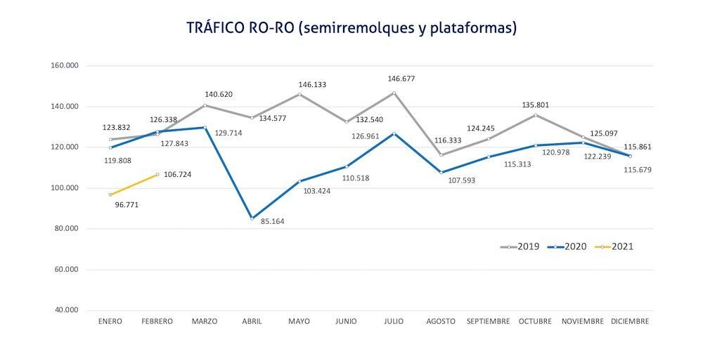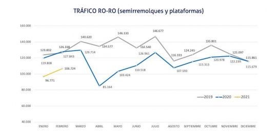 El tráfico ro-ro suma en los dos primeros meses de 2021 un total de 8.782.279 toneladas, un 14,4% menos que hace un año.