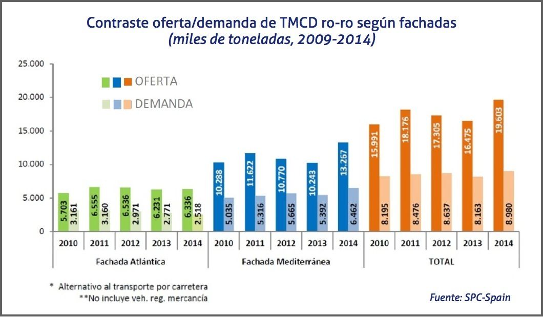 Del mismo modo que sucede con la oferta, la evolución del tráfico rodado también muestra grandes diferencias según la fachada. Así, en la atlántica se ha registrado un descenso en estos tráficos del 8,7%, hasta las 2,53 millones de toneladas, mientras que en la mediterránea se ha registrado un aumento del 13%, hasta las 12,57 millones de toneladas en 2014.