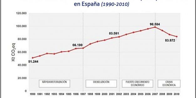 Así, mientras que el aumento de las emisiones en la década de los '90 se debió al aumento de vehículos en el parque nacional, en años posteriores, las políticas fiscales que favorecieron la compra de vehículos diésel, el menor precio de este combustible y el mayor poder adquisitivo de la población derivaron en un aumento de los kilómetros recorridos por carretera.