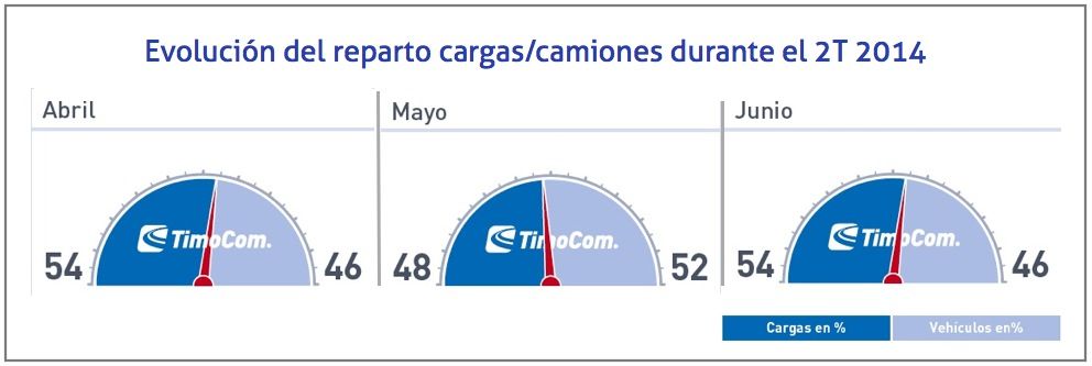 Según el barómetro de transporte de TimoCom, el segundo trimestre de 2014 ha terminado con un ratio de cargas y camiones de 52:48, una relación muy similar a la del mismo periodo de 2013, con un ratio de 53:47, y de 2012, el que el ratio fue de 54:46.