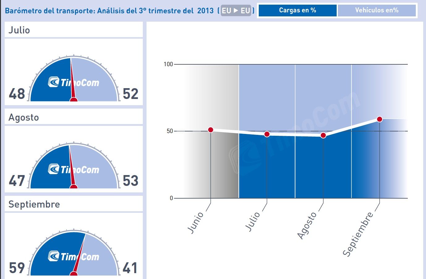 La proporción de cargas en el tercer trimestre de 2013, registrada en el barómetro del transporte de TimoCom, se sitúa en un 52%, lo que supone un aumento del 5% en comparación con el período anterior.