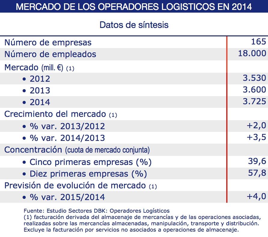Así, el volumen de negocio agregado de los operadores logísticos ha experimentado un crecimiento del 3,5% en 2014, hasta los 3.725 millones de euros, incluyendo los ingresos derivados del almacenaje de mercancías y las operaciones asociadas realizadas sobre las mercancías almacenadas, y excluyendo la facturación por servicios no asociados a operaciones de almacenaje.